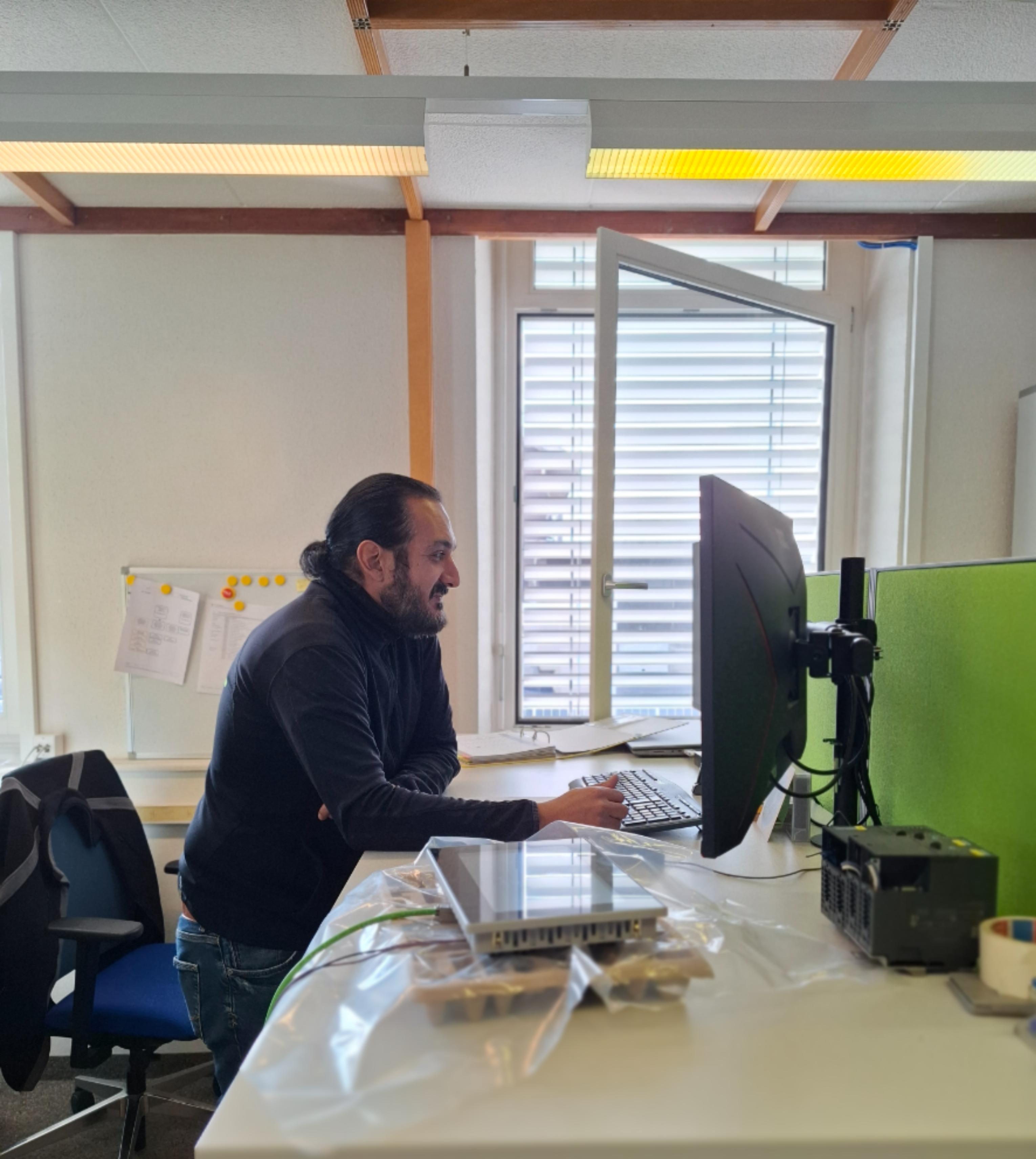 Enis berät Kunden, reagiert sofort bei Problemen und liebt den Wechsel zwischen Schreibtisch und Inbetriebnahmen ausser Haus.